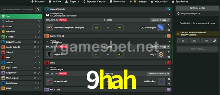 O 9hah oferece uma grande seleção de opções de apostas em e-sports com probabilidades competitivas